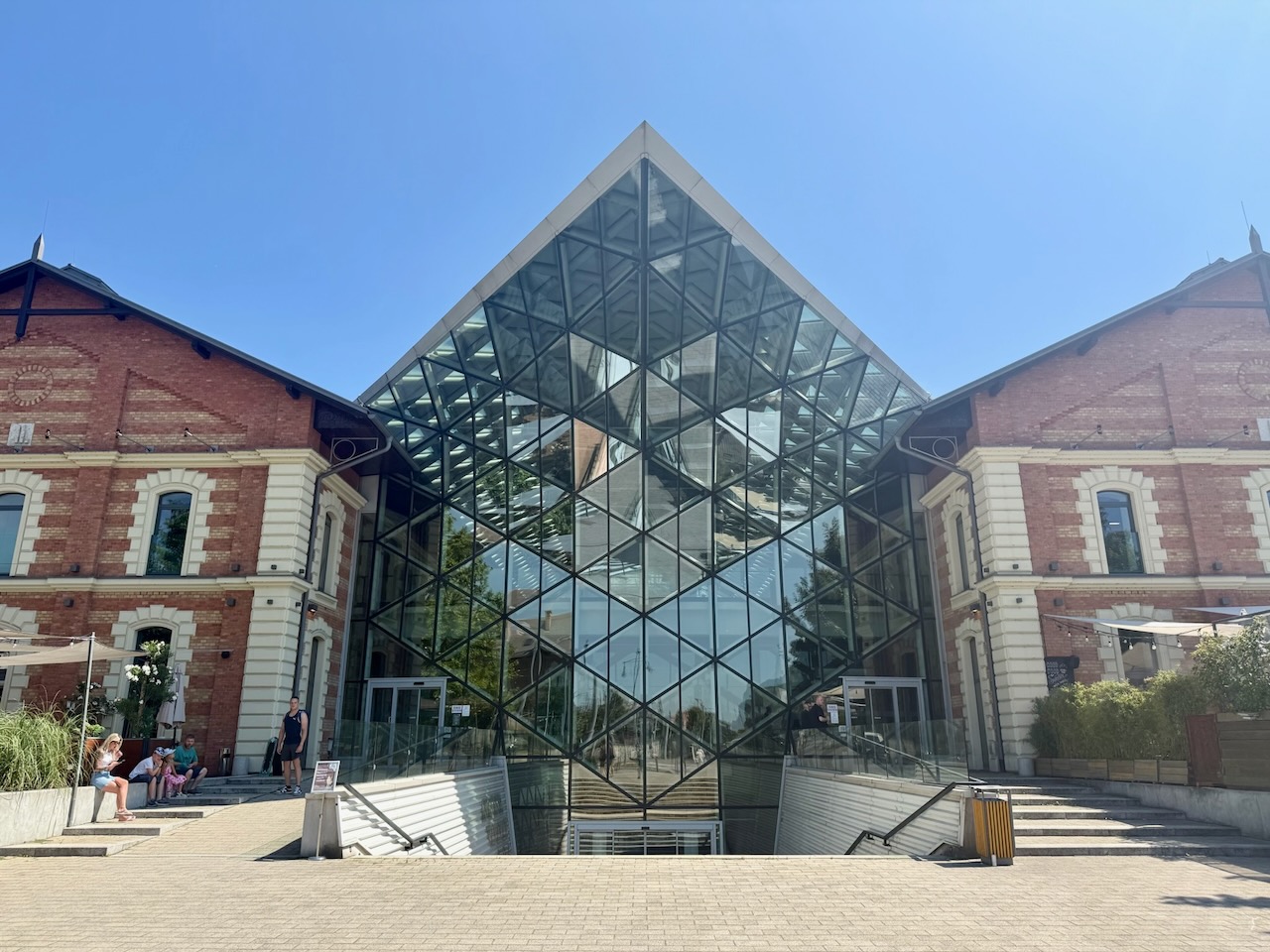 Nach dem Mittagessen, die schwere Lángos lag uns noch spürbar im Magen, spazierten wir in Richtung Donau und betrachteten die Flussschiffe, von denen manche unter Schweizer Flagge fuhren. Unser Ziel war die eindrucksvolle Bálna, ein Kulturzentrum, das aus zwei Reihen restaurierter roter Backsteinspeicher besteht, über denen ein Stahl-Glas-Dach liegt. Von weitem, etwa vom gegenüberliegenden Donauufer, wirkt die Konstruktion wie ein abstrakter Walkörper. Direkt hinter der Bálna entdeckten wir ein kleines Café, das in den Eingang einer Tiefgarage gebaut war. Solche originellen Orte bringen uns in Budapest immer wieder zum Schmunzeln und machen für uns einen Teil des Charmes dieser Grossstadt aus. Da wir uns nun gleich beim Hintereingang der Grossen Markthalle befanden, entschieden wir uns, doch noch hindurchzugehen, um von dort zu unserem Studio zurückzukehren.