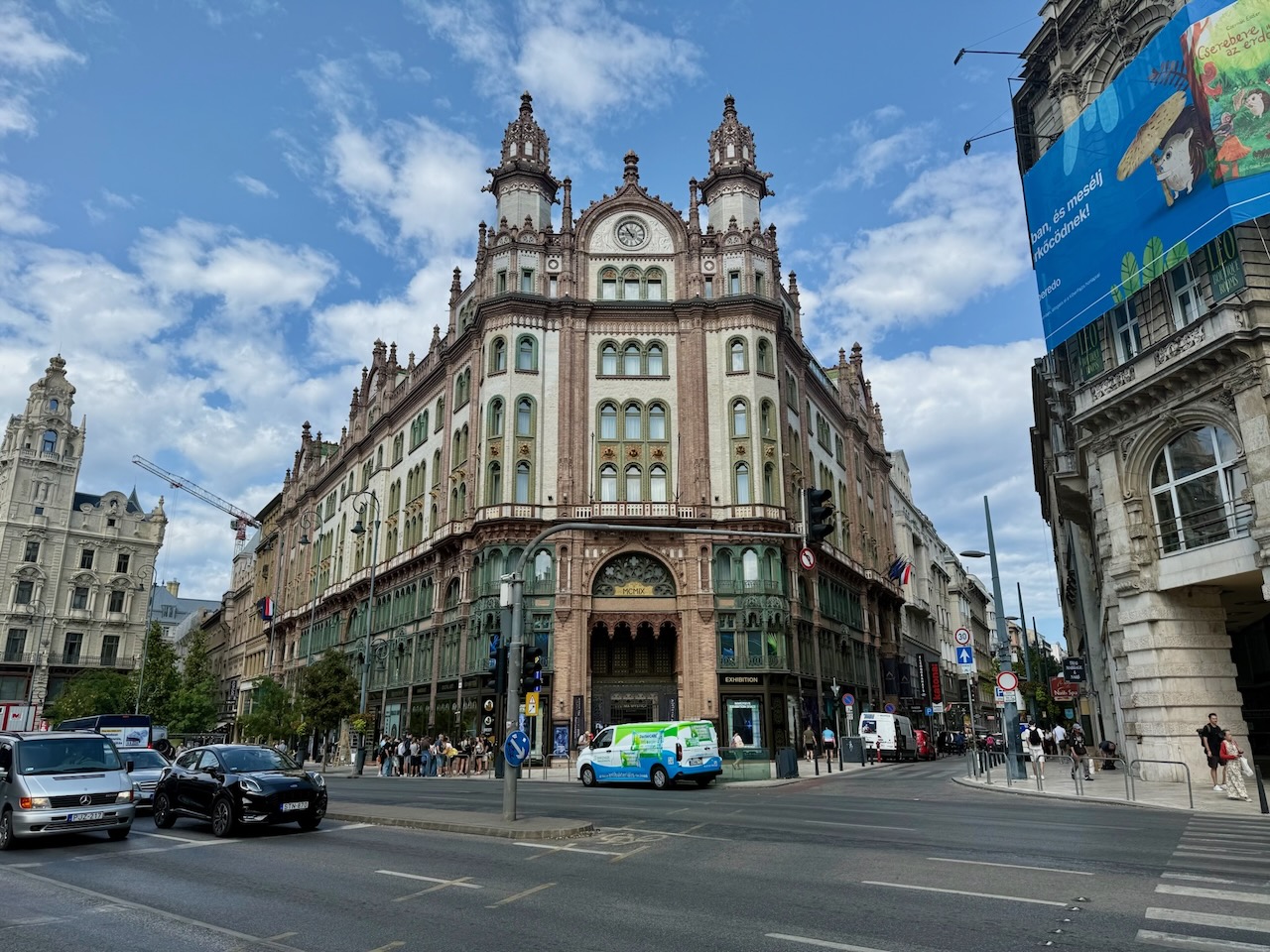 Am Abend brachen wir erneut auf, diesmal zum Westbahnhof «Nyugati». Dieser wurde vom Architekten August de Serres entworfen, das markante Stahl-Glas-Dach stammte aus dem Konstruktionsbüro von Gustave Eiffel. Seit seiner Eröffnung 1911 diente der Bahnhof auch immer wieder als Schauplatz für Spielfilme. In den 1980er-Jahren stand sein Dach mehrfach vor dem Abriss, da es in schlechtem Zustand war und das Geld für eine Renovation fehlte. 1990 trat jedoch McDonald’s als Investor auf, sodass das Glasdach erhalten blieb, allerdings wurde an der Flanke ein Einkaufszentrum errichtet. Seit 2022 laufen Pläne, den Bahnhof umfassend zu sanieren: Ein dreistöckiger Untergrundbahnhof soll die Funktion der jetzigen Halle übernehmen, während die alten Mauern und das historische Dach erhalten bleiben.
