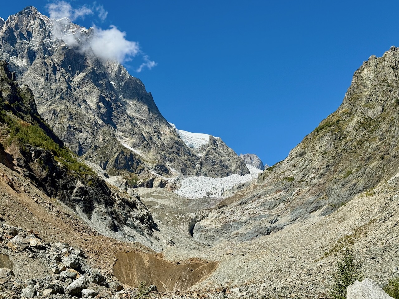 Da wir nicht nochmals den steilen Aufstieg auf uns nehmen wollten und ein Taxi bis zur Gleitschirmstartbahn für uns nicht in Frage kam, gingen wir zum Chalaadi Gletscher. In mehreren Berichten steht, dass der Weg bis zum Ausgangspunkt der eigentlichen Wanderung nicht besonders toll sei und es wird, empfohlen ein Taxi bis dorthin zu nehmen. Wir wollten es selber wissen und nahmen den Weg auf uns. Der Weg geht zuerst alles durchs Dorf und ist ganz hübsch. Nach einiger Zeit biegt entlang dem Mestiaschala entlang parallel zum Flughafen immer ganz langsam bergauf. In diesem Bereich der Gemeinde wird viel gebaut, vor allem Gasthäuser und kleine und grössere Chalets. Dieser Teil ist noch in Ordnung aber nicht mehr wirklich schön. Nach dem Flughafen überquert man den Mestiaschala und folgt im weiter Bergauf. Hier wanderten wir grösstenteils auf einer unbefestigten Strasse und immer wieder überholten uns Baufahrzeuge und wir mussten ihnen ausweichen. Dies ist wirklich nicht gerade ein Weg, den wir weiterempfehlen können. Am Ende des Weges passiert man das Wasserkraftwerk, das der Grund für all die Baufahrzeuge ist. Pascal war zwar froh, als wir den Beginn der eigentlichen Wanderung ankamen, als wir aber die Hängebrücke sahen, war seine anfängliche Begeisterung gleich wieder verflogen. Die Holzplanken, auf denen man gehen sollte, waren durchgebrochen und fehlten teilweise komplett. Am Ende der Hängebrücke musste man sich um einen Felsen hangeln, dessen Befestigung der der Hängebrücke in nichts nachstand. Aber auch diese Aufgabe meisterten wir, wenn auch mit erhöhtem Puls. Am anderen Ende der Hängebrücke gibt es ein Kaffee, in dem man auch Speisen könnte, wir liessen dies rechterhand liegen und fokussierten uns auf unseren eigentlichen Plan, dem Gletscher näher zu kommen. Es ging in einem Nadelwald einen schmalen Wanderweg entlang, bis man wiederum den Gletscherbach erreicht, den man schon von weitem tosen hört. Eva vergewisserte sich mit ihrer Hand, dass der Bach wirklich eisig kalt ist und bestätigte mir das umgehend. Danach folgt der Wanderweg in kleinerem und grösserem Abstand alles dem Bach, bis sich der Wald auftut und wir auf eine Art Kiesinsel landeten. Der Gletscher war schon von da aus sehr beeindruckend, aber wir wollten noch ein wenig näher heran und folgten weiter dem Bach, hie und da einige Kletterpartien miteingeschlossen. Bei dieser Wanderung kommt man dem Gletscher nah, man steht eigentlich direkt unter der Moräne und sieht die Eismassen vor sich in die Höhe ragen. Wir bestaunten einige Zeit dieses Naturschauspiel und machten von uns und Emre Fotos, ein Kerl aus Istanbul den wir hier kennenlernten. Nach einiger Zeit brachen wir auf, um den Rückweg anzutreten, es war schon einige Zeit ins Land gezogen und wir wollten nicht allzu spät zurück sein. Nachdem wir bei der Hängebrücke angekommen waren und zumindest Pascal mit zitterigen Knien diese ein zweites Mal überquerte, fragte uns Emre ob er uns mitnehmen könne und wir sagten nur allzu gerne zu, damit wir den nicht gerade vielversprechenden Weg überspringen konnten und noch ein wenig Zeit mit ihm verbringen konnten. Er erklärte uns, dass er ein AirBnB in Istanbul besitze und wir tauschten Nummern, also falls bald jemand von euch nach Istanbul geht, können wir vielleicht ein Apartment vermitteln.