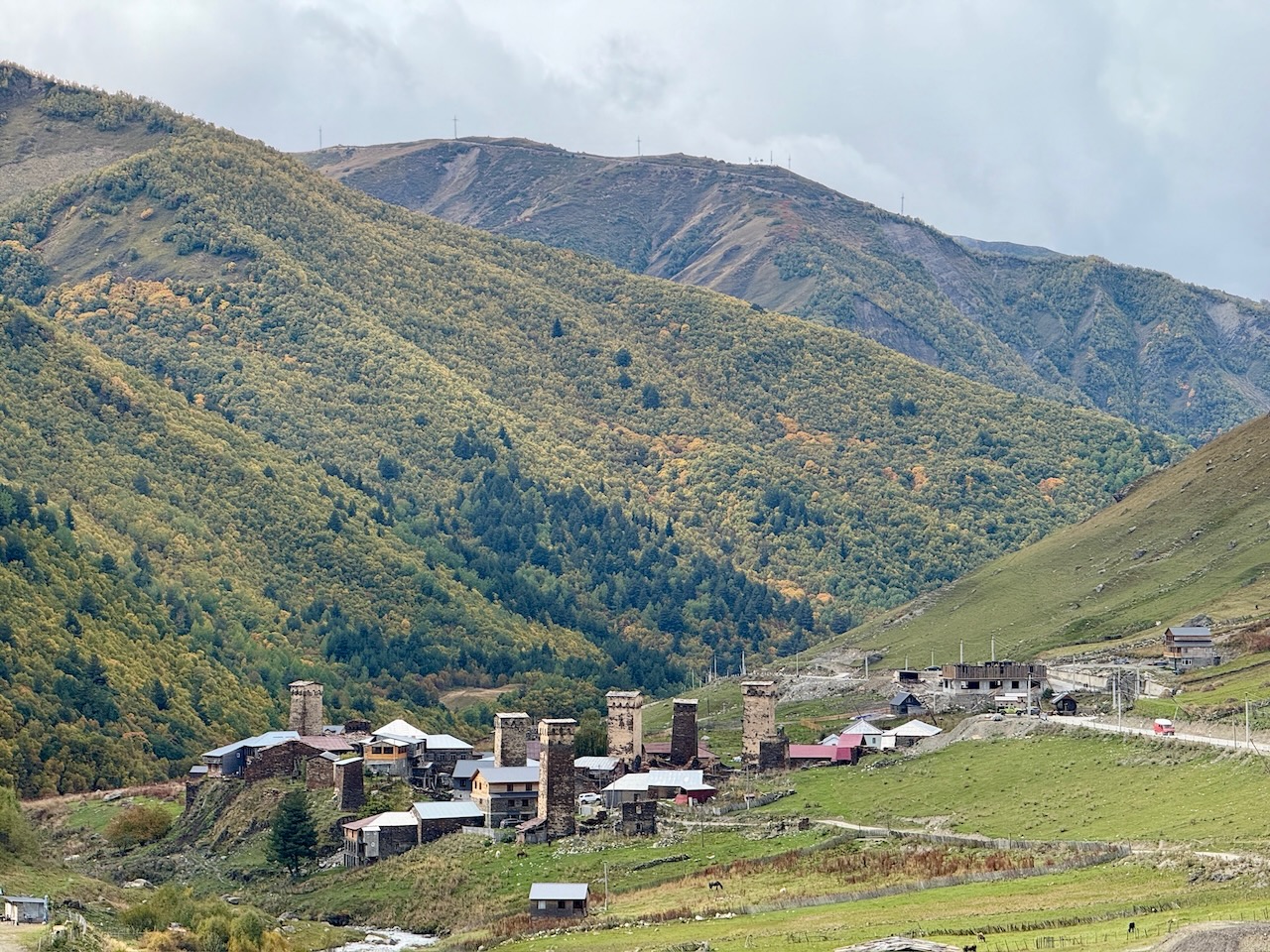Wenn man von Georgien liest, kommt man um Swanetien kaum herum. Die Region im Norden des Landes, mitten im grossen Kaukasus liegend, grenzt direkt an Russland und der Gebirgszug mit vielen hohen Gipfeln markiert auch gleichzeitig die natürliche Grenze zu Russland. Da das Gebiet aber ein wenig abgelegen liegt, ist es nicht ganz einfach dorthin zu gelangen. Zwar fahren von Tbilisi direkte Marschrutkas nach Mestia und auch wenn es mit Abstand die günstigste Möglichkeit ist dorthin zu kommen, sind zehn bis elf Stunden weitere Marschrutkafahrt nicht unbedingt das, auf was wir uns freuten. Die andere Option, von der wir gelesen haben, ist mit dem Zug sieben Stunden nach Zugdidi zu fahren, dort hiess es, stünden Marschrutkas parat, die einen nach Mestia bringen würden. Da uns sieben Stunden Zugfahrt um einiges bequemer erschien als die vollgestopften Kleinbusse, kauften wir uns Fahrkarten im Voraus und standen im Morgengrauen im Tbiliser Bahnhof, stiegen in den Zug und auf ging es nach Zugdidi. Aufgrund der längeren Reise kauften wir uns erste Klasse Tickets. Im Zug befanden sich 90% Menschen in Wanderkluft gekleidet und mit Rucksäcken und Stöcken bewaffnet. Die meisten sprachen Englisch, Deutsch oder Holländisch und wir machten uns schon Sorgen, ob tatsächlich derart viele Marschrutkas in Zugdidi auf uns warten würden. Angekommen am Endbahnhof sahen wir schon die typischen Schilder, die normalerweise in den Marschrutkas in der Frontscheibe liegen mit Pfeilen versehen, die die Richtung zu den Bussen wiesen. Mit unserer Befürchtung, dass eventuell zu wenige Marschrutkas warten werden, lagen wir komplett falsch. Scheinbar hatten die Betreiber genügend Erfahrung, denn es hatte ziemlich genau so viele Plätze wie Personen, die nach Mestia wollten. Da der Andrang im Herbst sicherlich nicht derart gross sein wird wie im Sommer, wird da der Kampf um die freien Plätze vielleicht grösser. Wir fuhren los und nach den ersten paar Gebirgskurven fuhr der Fahrer zu einer Tankstelle und machte voll. Der Tank war voll, doch er konnte die Tankfüllung nicht bezahlen, also ging er lachend durch den Bus und kassierte die 35 Lari Fahrtpreis ein. In der Hälfte der Fahrt gab es eine kurze Pinkelpause und etwa um 19:00 trafen wir in Mestia ein. Der Ort ist der Hauptort in Swanetien und Ausgangspunkt für viele Wanderungen in der Region. In der Mitte des Ortes befindet sich eine Art Platz der als Parkplatz und Busbahnhof genutzt wird und die Polizei und Gemeindeverwaltung angesiedelt ist. Da wir noch keine Unterkunft gebucht hatten, im Unwissen, ob wir rechtzeitig in Mestia ankommen werden, mussten wir das noch nachholen und kaum bei Booking gebucht, versuchten wir die Gastgeber zu kontaktieren. Sie waren relativ überrascht, dass derart spät noch eine Anfrage reinkam, aber sie kamen nochmals zum Gasthaus, um uns ein Zimmer parat zu machen. Das Zimmer war relativ gross und relativ sauber, aber wirklich schön wäre etwas anderes. Wir gingen nochmals los, um in der Stadt etwas zu essen und kehrten ins Leila ein. Das Restaurant und Café ist im Inneren ein bisschen wild dekoriert, mit alten Skiern und allerlei Accessoires und die Personen, die den Laden führen sind immer zu Spässen aufgelegt. Serviert werden allerlei georgische und lokale Speisen, viele die wir bisher noch nicht probieren konnten. Nach dem Essen ging es wieder zurück zur Unterkunft und die Bergluft und die lange Anfahrt liess uns schnell und tief schlafen.