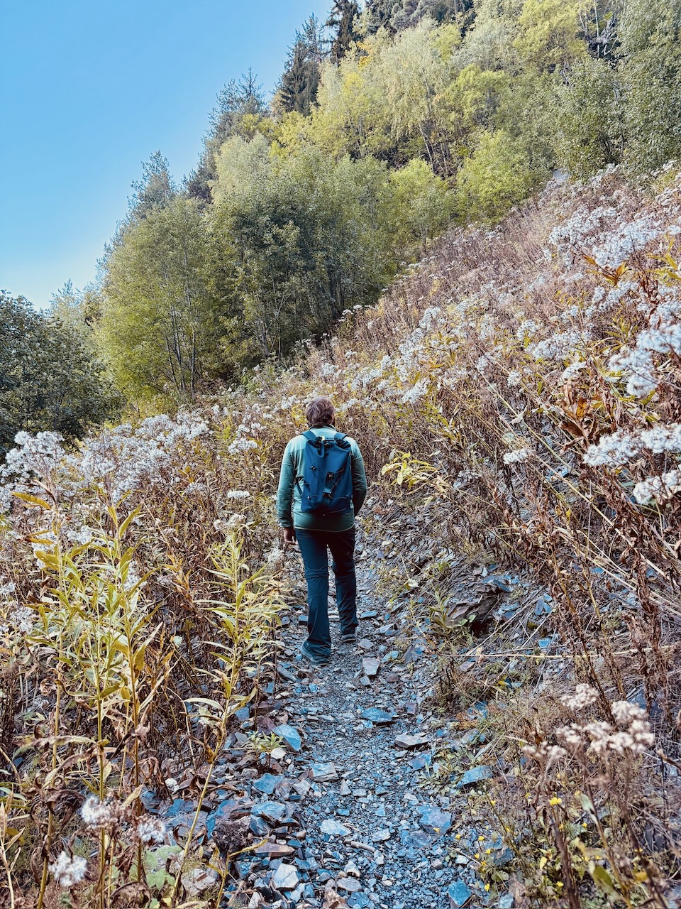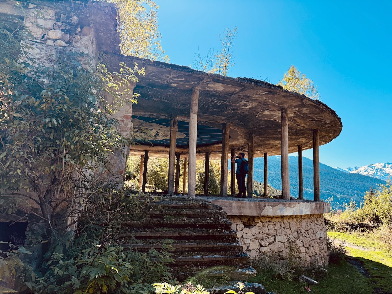 Die allermeisten Personen, die nach Mestia kommen, sind hier, um den Uschguli-Mestia-Trek zu machen. Die Mehrtageswanderung führt alles das Tal entlang und man übernachtet jeweils in den kleinen Dörfern entlang der Strecke. Da wir für eine Mehrtageswanderung nicht ausgerüstet waren, aber trotzdem einen Teil dieses Treks machen wollten, liessen wir uns am nächsten Tag mit dem Taxi bis nach Zhabeshi fahren. Der Fahrtpreis und den Treffpunkt haben wir schon am Abend zuvor mit dem Taxifahrer ausgehandelt und so klingelte unser Wecker relativ früh und als wir das Gasthaus verliessen, hörten wir Reifen quietschen und sahen ein Auto beinahe einen Vollstopp reissen. Es war unser Taxifahrer, der uns gerade entdeckt hatte und uns mitnehmen wollte. Also sprangen wir auf und der Fahrer gab Gas und in Nullkommanichts waren wir schon am Ausgangspunkt der Wanderung angekommen. Zhabeshi ist ein sehr kleines Dorf und die erste Tagesetappe, wenn man den Mehrtagestrek nach Ushguli machen will. Wir wanderten den Trek in die entgegengesetzte Richtung, um am Ende nicht in Zhabeshi ohne Rückfahrtmöglichkeit zu sein. Das Dorf bestand aus ein paar der für die Gegend bekannten Wachtürme und einigen Höfen. Wir waren derart früh dran, dass der Morgennebel das Dorf noch komplett einnahm und ausser uns nur die Kühe wach waren, auf dem Weg zur Weide. Die leichte Nässe und die Kälte zog in die Kleider und bevor wir wirklich froren, machten wir uns auf den Weg zurück nach Mestia. Der erste Teil des Weges führt alles dem Fluss Mulcha entlang. Da es in den Tagen zuvor doch einiges geregnet hatte, war der Weg oft matschig und rutschig und wir mussten vorsichtig agieren, um nicht am Hang hinunterzurutschen. Die Pfade der ersten paar Stunden sind praktisch alle Kuhpfade und nicht nur einmal mussten wir einer Kuh ausweichen, oder ihr zu verstehen geben, dass sie uns Platz machen müsse. Nach etwa 3km überquerten wir einen Gebirgsbach den Khelar auf einer wackeligen Holzplanke und danach geht es nur noch bergauf. Wir durchquerten das swanetische Dorf Tscholaschi, überquerten nochmals einen Gebirgsbach die Kherazhi, der derart viel Wasser fasste, dass er auch gleich die Strasse mitüberflutete, was keinen der Autofahrer daran hinderte, weiterzukommen. Weiter gingen wir durch die Dörfer Zhamushi, Lakhiri, bis wir oberhalb der Dörfer waren und zwischen Waldrand und Talsohle dem Wanderweg weiter folgten. Immer wieder begegneten wir Wanderern die in kleineren oder grösseren Gruppen die gleiche Etappe, aber mit dem Tagesziel Zhabeshi absolvierten. Kurz vor dem Flughafen von Mestia, es fliegt täglich eine Propellermaschine nach Tbilisi, geht es den ganzen Aufstieg wieder runter. Einige Stellen sehr steil. In diesem Abschnitt kamen uns am meisten Wanderer entgegen, die gerade die Mestia-Ushguli-Wanderung starteten. Wir wunderten uns, dass derart viele Personen noch so spät eine fünf bis sechsstündige Wanderung starten, aber sie werden schon wissen, was sie tun. Gleich nach dem Abschnitt, führt der Weg an einem verlassenen Skiresort vorbei, dass während der Sowjetzeit sehr beliebt gewesen sein sollte. Heute kann man noch die Aufteilung der Zimmer erahnen, der grossen Speisesaal und die Veranda, aber das meiste wurde schon von der Natur zurückgeholt. Am Ende der Strecke erreichten wir Mestia von einer komplett anderen Seite, wo wir ein Café fanden, mit einer wunderschönen Dachterrasse mit Aussicht auf Mestia und die umliegenden Berge. Serviert bekamen wir den grauenhaftesten Kaffee, den wir je getrunken hatten, wir waren bisher wirklich verwöhnt.
