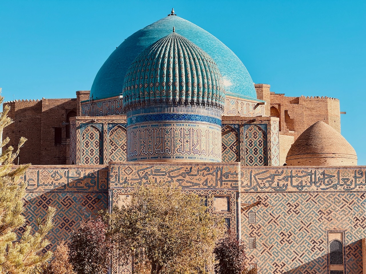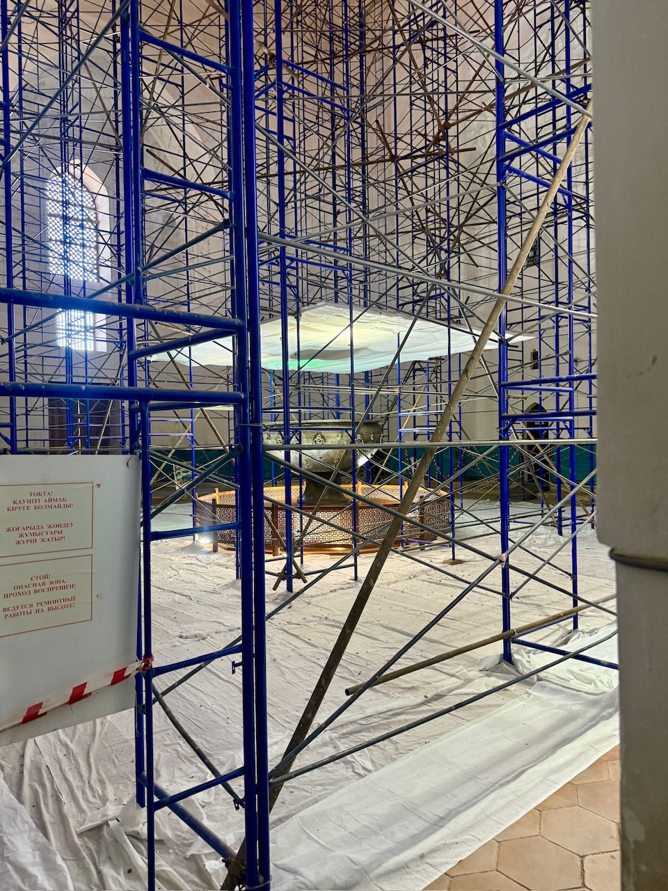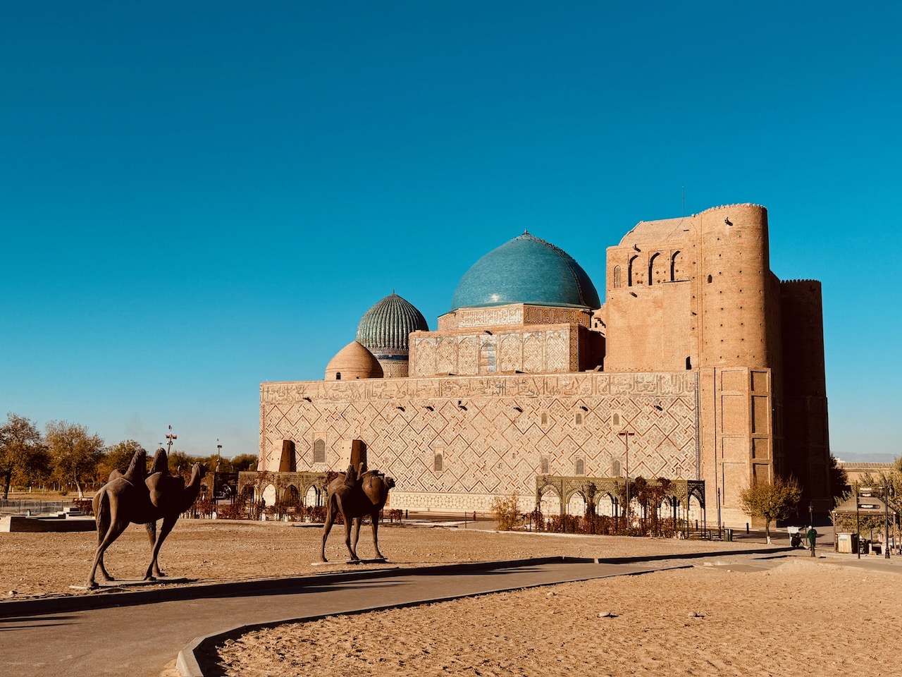 Wir verliessen das Hotel und holten uns auf dem Weg eine Somsa, die zentralasiatische Variante der in der Schweiz bekannten indischen Samosas. Unser Ziel war das antike Fort von Turkestan, welches vom Hotel in Gehdistanz liegt. Der rundumliegende Park und auch das Fort können kostenfrei besichtigt werden. Da wir aber, wenn wir schon da sind, auch die Untergrundmoschee und das Mausoleum besuchen wollten, holten wir uns am Ticketschalter entsprechende Karten. Das Mausoleum von Hodscha Ahmad Yasawi wurde vom mongolischen Herrscher Timur Ende des 14. Jahrhunderts erbaut. Dabei wurden viele architektonische Formen wie der Iwan oder die Kuppel ausprobiert und dienten später als Vorlage für die Gebäude in Timurs Hauptstadt Samarkand. Leider konnten wir das Innere aufgrund von Bauarbeiten nicht wirklich besichtigen und fühlten uns von der Ticketverkäuferin ein wenig übers Ohr gehauen. Dafür war wenigstens die Hilvet-Untergrundmoschee, die von Hodscha Ahmad Yasawi eigenhändig in den Boden gegraben wurde, für Besucher offen. Heute ist sie sowohl Gebetsraum wie auch Museum und für viele Muslime der Region ein wichtiger Pilgerort. Die Moschee stammt aus dem 13. Jahrhundert und ist exemplarisch für die damalige Bauweise, bei der Häuser komplett oder teilweise unterirdisch gebaut wurden, um Kältedifferenzen und Stürmen besser zu trotzen.