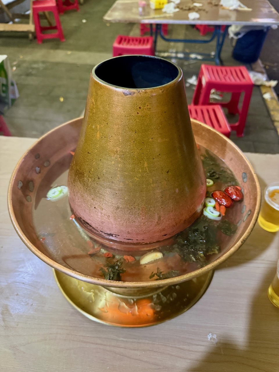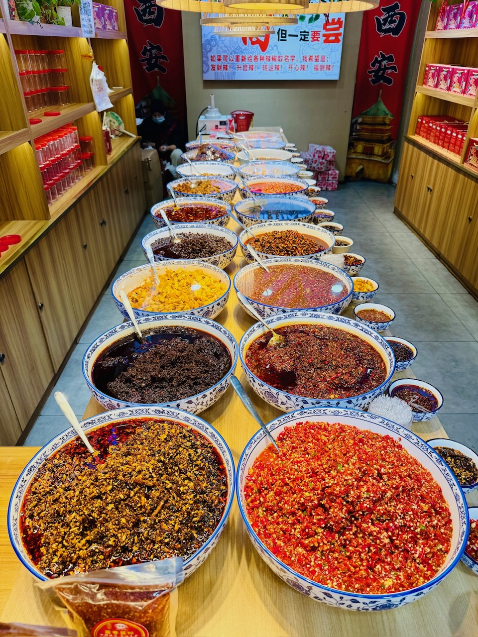 Wir holten uns an einem Stand im muslimischen Viertel ein paar Dumplings in Chilisauce und schlenderten von da aus der alten Stadtmauer entlang, bis wir zu einem kleinen Ausschank kamen, neben dem eine Hotpot-Strassenküche war. Eigentlich wollten wir uns gleich hier hinsetzen, um zu essen, da wir aber noch den Transport für den nächsten Tag organisieren mussten, nahmen wir erst ein Taxi zu einem Stand direkt neben dem Glockenturm, um uns Bustickets zu kaufen. Wir mussten angeben, in welchem Hotel wir untergebracht waren und welche Zimmernummer wir hatten, und im Gegenzug bekamen wir eine Zeit genannt, wann wir abgeholt werden würden. Von dort marschierten wir schnurstracks wieder zurück an die Ecke, wo wir das Hotpot-Restaurant gesehen hatten. Wir setzten uns hin und mit wildem Gestikulieren und der Smartphone-Übersetzungs-App bestellten wir alle Zutaten für unser Abendessen. Es war einfach köstlich.