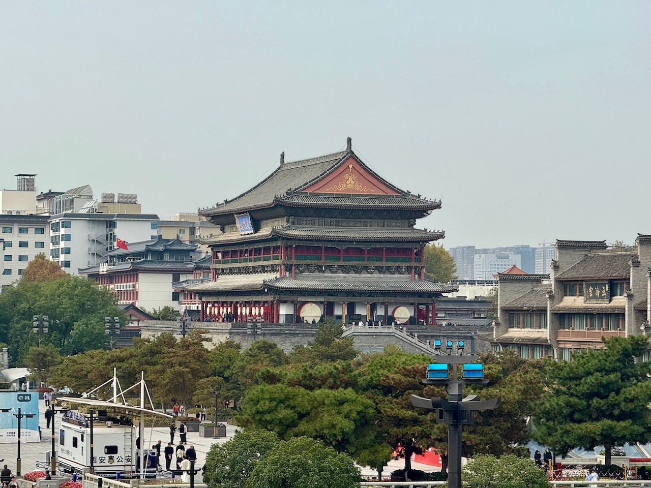Wenn wir einmal einen guten Kaffee in einem Ort gefunden haben, bleiben wir dem treu. Wenn das Café auch noch in Gehdistanz zu unserer Unterkunft liegt und es nicht zu einer grossen Kaffeekette gehört, fühlen wir uns bald wie zu Hause. Im Katzen-Café tranken wir Cappuccino, und Eva streichelte Katzen; spannenderweise hatten wir beide kein Problem mit Allergien, obwohl eigentlich beide in der Schweiz immer gleich anfangen zu niesen und unsere Augen tränen. Von dort starteten wir den Tag mit den beiden grossen Türmen. Wir versuchten, noch vor der Stadtmauer via U-Bahn und Unterführung zum Glockenturm zu gelangen. Es war bedeutend schwieriger als gedacht. Wir kamen uns vor wie in einem Zeichentrickfilm: Egal, wo wir die Treppe wieder hochstiegen, waren wir irgendwo rund um das Stadttor und den Glockenturm; den richtigen Ausgang hatten wir erst beim sechsten oder siebten Anlauf gefunden. Obwohl es nicht wirklich der richtige Ausgang war – wir standen vor der Kasse zur Stadtmauer und nicht zum Glockenturm, wo wir ja eigentlich hinwollten –, gingen wir nochmals in eine andere Unterführung, legten dort nochmals zwei Runden und etwa 500 Meter zurück, bis wir tatsächlich in der Tiefe des Metro-Labyrinths das Kassenhäuschen für die beiden Türme fanden. Es war nicht das erste Mal, dass wir froh waren, beide Bezahl-Apps WeChat (Weixin Pay) und Alipay installiert zu haben, denn meistens geht beides, aber hier funktionierte nur WeChat Pay problemlos. Deutsche, die mit uns in der Reihe standen, fluchten, als ihre Alipay-App die Bezahlung wiederholt ablehnte, bis sie bemerkten, dass auch Mastercard und Visa akzeptiert wurden. Gleich neben dem Kassenhäuschen befand sich auch der Aufgang zum Vorplatz des Glockenturms; wir waren wirklich sehr froh, als wir es endlich geschafft hatten und nach Gepäckkontrollen auch das Gebäude betreten durften.