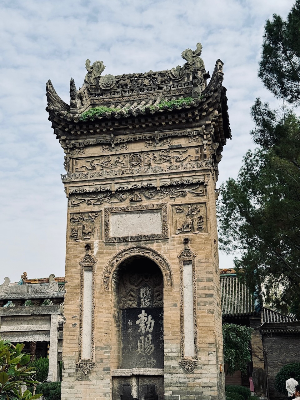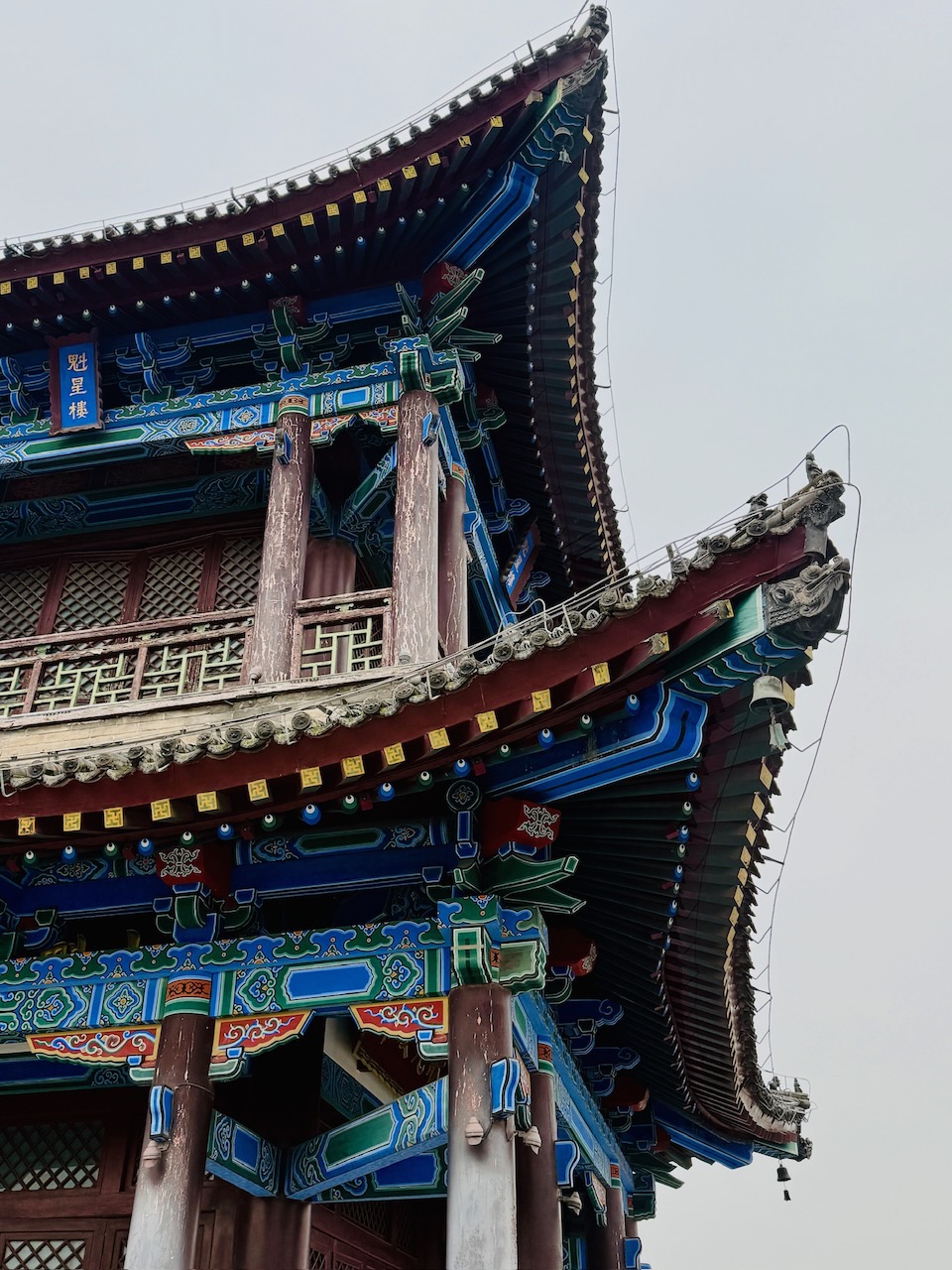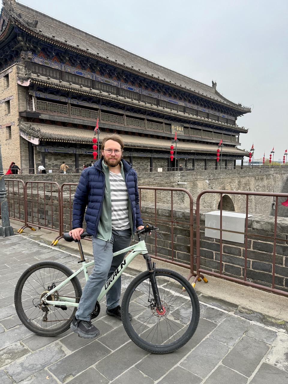 Den letzten Tag in Xi’an liessen wir ruhig angehen. Leider war das Wetter mässig, trotzdem gingen wir zur alten Stadtmauer und bezahlten den für eine Stadtmauer horrenden Eintritt. Wir hatten schon von anderen Reisenden gelesen, dass man auf der Stadtmauer Fahrräder mieten könne, und so taten wir es auch. Da wir die Höhe der Sitze nicht ändern konnten, fuhren wir zur nächsten Ausleihstation und wechselten unsere Räder nochmals aus. Dann waren wir auch schon bereit, die Stadt damit zu umrunden. Von hier oben hat man einen wunderbaren Ausblick auf die Stadt, einige schöne Gebäude, und immer nach ein paar Kilometern gibt es kleine Räume, in denen irgendetwas zur Geschichte Chinas erklärt wird, wie zum Beispiel die typischen Ziegeldächer und warum sie die runde Form haben. Was uns aber wirklich ins Auge stach und ab da an auch unsere Reise durch ganz China begleitete, waren die hunderten jungen Menschen, meist Frauen, die sich in klassischen Hanfu kleideten, um sich von (semi-)professionellen Fotografen ablichten zu lassen. Reisefotografie bekommt mit Douyin, dem chinesischen Pendant zu TikTok, ganz neue Sphären. Die Eingangstore der Stadtmauern waren derart voll, dass viele sich um die besten Plätze zankten. Es gab sogar extra Orte, an denen die Fotografen ihr Equipment verstauen mussten, damit nicht der ganze Weg voll von Stativen war. Wir beendeten unsere Rundfahrt und gingen von dort aus wieder zu unserer Lieblingsnudelküche im muslimischen Viertel. Leider hatten sie am Mittag nur kalte, saure Nudelsuppe, und wir konnten sie an diesem Tag leider nicht wirklich genießen, auch wenn wir im Nachhinein sagen müssen, dass sie eigentlich sehr gut und speziell war. Wir schlenderten noch durch die Stadt und haben noch ganz viele schöne Ecken entdeckt: einen taoistischen Tempel, ein Viertel mit vielen alten Häusern und viele kleine und grössere Dinge, die uns trotz der zweiten Woche in China immer wieder erstaunten. In Xi’an bewegten wir uns fast nur innerhalb der historischen Stadtmauern; es gäbe in dieser Stadt sicherlich noch viel mehr zu entdecken.