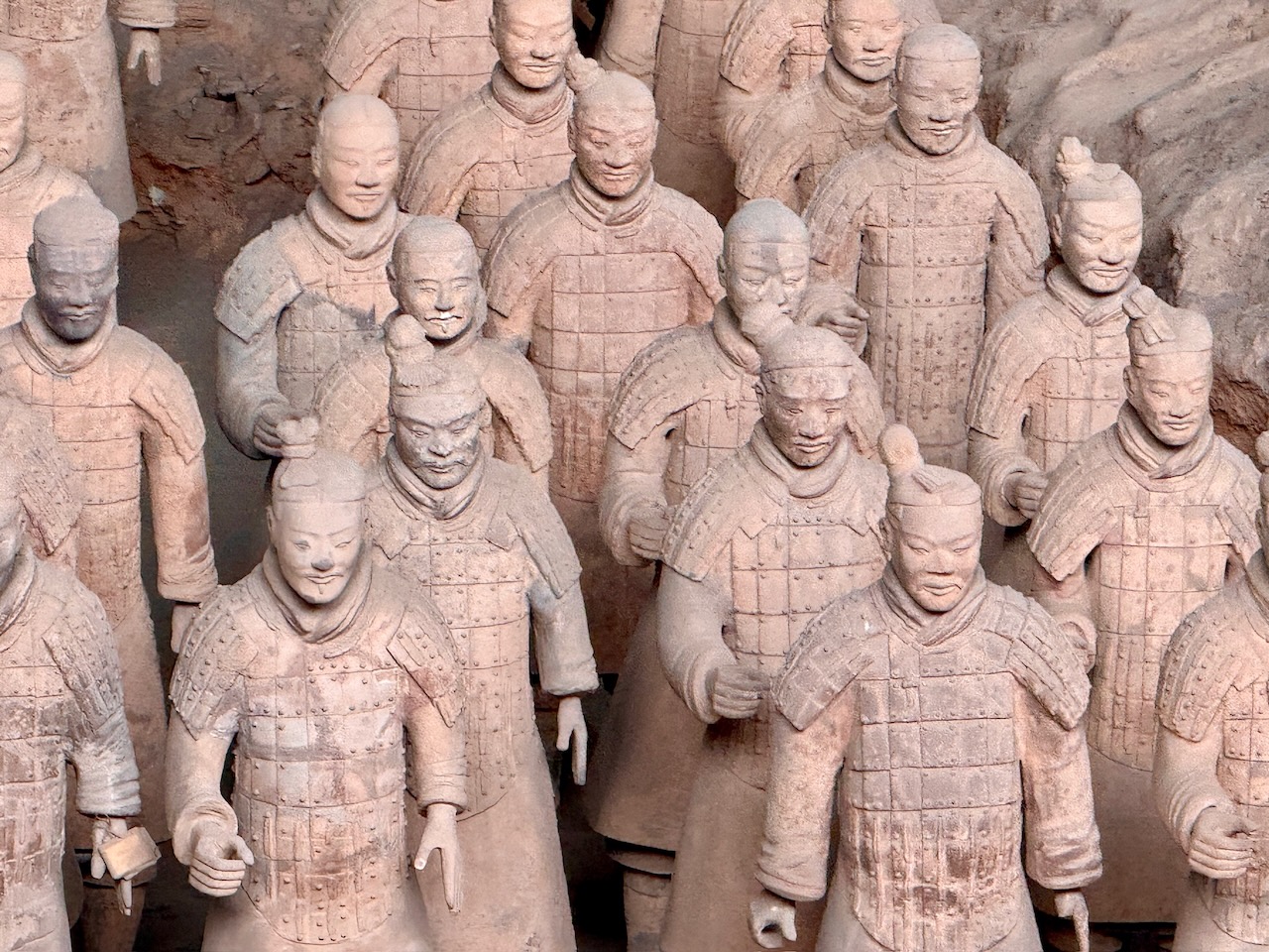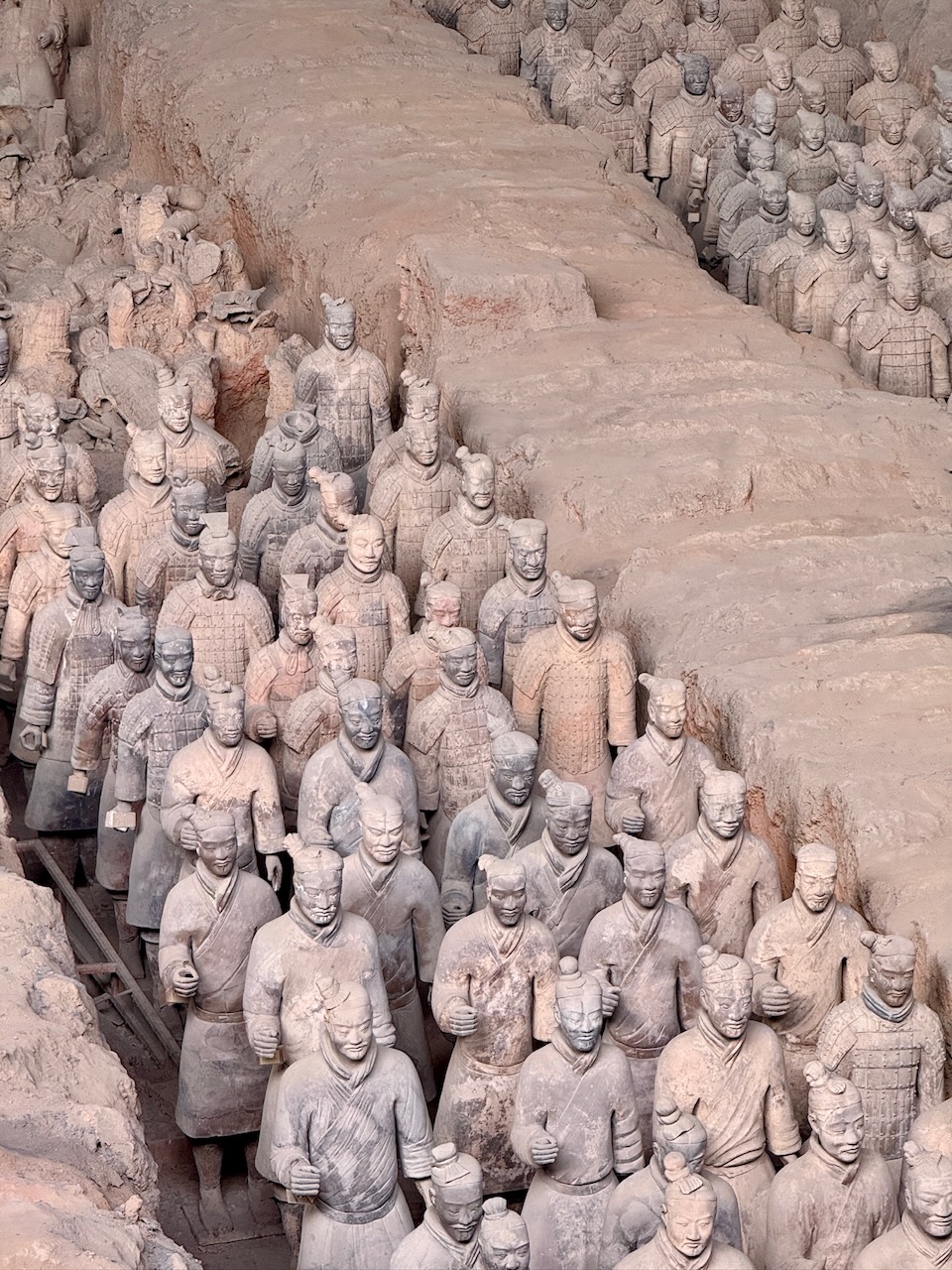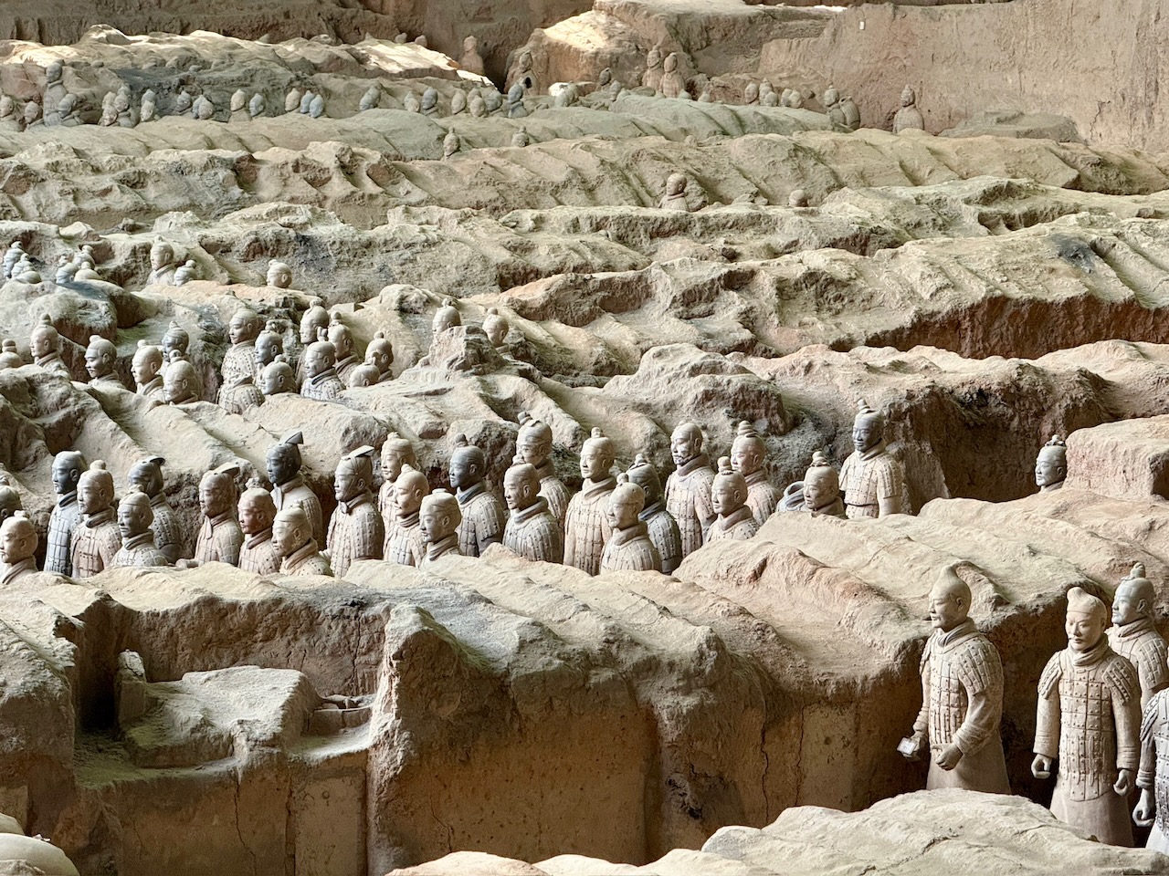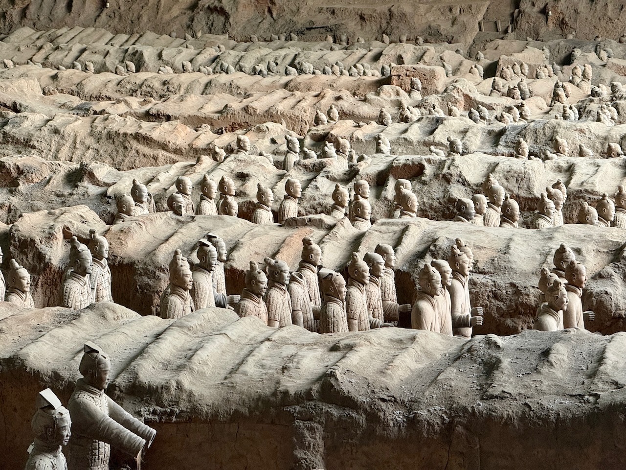 Am nächsten Morgen klopfte es viel zu früh an unserer Türe. Wir kapierten erst jetzt, dass für uns extra jemand abgestellt worden war, um uns rechtzeitig im Hotel zu wecken. Schnell machten wir uns parat und gingen in die Lobby, wo wir unsere «Aufpasserin» fanden. Sie telefonierte schnell mit dem Busunternehmen, und nur einige Minuten später kam auch schon der Bus, der uns zu den Terrakotta-Kriegern bringen würde. Der Reiseleiter empfing uns, und wir nahmen unsere Plätze ein. Alles in allem kostete der organisierte Transport nur unmerklich mehr als der öffentliche Bus, und da wir auf der genau anderen Seite der Stadt unsere Unterkunft hatten, sparten wir so auch Stunden in allen möglichen Fortbewegungsmitteln. Der Reiseleiter sagte, dass die Tour zuerst in ein Museum gehen würde, da wir aber terminierte Tickets direkt früh am Morgen hatten, wollten wir direkt zu den Ausgrabungsstätten gehen. Ob er es wirklich verstanden hatte, waren wir uns nicht wirklich sicher. Er nahm ein Mikrofon in die Hand, drehte den Lautstärkeregler ans Maximum und begann einen Monolog, der die ganze Fahrt andauern würde, nur unterbrochen durch grosse Schlucke aus seiner Wasserflasche, welche geräuschvoll über die Lautsprecher an die Ohren der Mitreisenden transportiert wurden. Irgendwann hielt der Bus, alle stiegen aus und wir wurden tatsächlich ganz alleine direkt an den Eingang zu den Ausgrabungsstätten gefahren. Was für ein Luxus! Dort angekommen, reihten wir uns ein; egal, wo wir hinschauten, gab es dutzende Fähnchen in der Luft, die die verschiedenen Reisegruppen anzeigten. Da es für Nicht-Chinesen einen separaten Eingang gab, konnten wir relativ weit nach vorne. Unser Reisepass – auch hier gleichzeitig unser Ticket – wurde gescannt und wir durften eintreten. Wir machten uns schnurstracks auf zur grössten Ausgrabungshalle, und auch wenn dort schon hunderte andere waren, konnten wir doch relativ gut die Terrakotta-Krieger bestaunen. Es ist wirklich grossartig, wenn man bedenkt, dass keine zwei Figuren sich aufs Haar gleichen, verschiedene Alter darstellen, verschiedene Rüstungen tragen und alle echte Einzelstücke sind. Es gibt Bogenschützen, Soldaten mit Schwertern und Äxten, Pferde mit Streitwagen und so weiter. Die etwa 8000 Figuren wurden 220 vor Christus vom ersten Kaiser von China als Grabbeigabe in Auftrag gegeben, um den Kaiser auch im Jenseits zu beschützen. Es war wirklich spannend, und wir blieben recht lange an diesem Ort und besuchten die Ausgrabungsstätte ein wenig später nochmals, als ein bisschen Ruhe einkehrte und die erste Welle von Touristengruppen vorbeigezogen war. Daneben gibt es noch zwei weitere Ausgrabungsstätten, die aber weitaus unspektakulärer sind als die erste grosse Halle. Im dazugehörigen Museum wurde noch gezeigt, wie die Figuren ursprünglich bemalt worden waren, und es gab sehr viele Tafeln zur Geschichte des Kaisers zu lesen. Irgendwie verging der Tag wie im Flug, und schon bald bekamen wir vom Reiseleiter eine WeChat-Nachricht, dass er gerne bald zurückfahren würde. Wir verliessen also das Gelände, und draussen erwartete uns ein riesiger Food-Court mit allen westlichen und chinesischen Fastfood-Läden, die es gibt. Wir gönnten uns tatsächlich einen Burger bei «Ronald», bevor wir zum angegebenen Treffpunkt kamen. Unser Reiseleiter war komplett verschwitzt und sah fix und fertig aus. Jedes Mal, wenn sich jemand von der Gruppe löste, um noch etwas zu essen zu holen, wie auch Eva, die uns einen Kaffee holte, bekam er immer leicht Panik. Wir schafften es dann doch alle zusammen zurück in den Bus, und sobald er sich in Bewegung setzte, schrie es wieder durch die Lautsprecher – diesmal aber nicht mit allgemeinen Informationen, sondern mit allerlei Produkten, die er anpries und die Rückfahrt so zu einer Kaffeefahrt umfunktionierte. Mit dröhnenden Ohren kamen wir wieder bei unserem Hotel an und waren fix und alle. Trotzdem rafften wir uns nochmals auf, gingen zurück zu dem Nudelstand, an dem wir am ersten Abend gegessen hatten, und bestellten andere Gerichte: Spätzle in kalt-saurer Suppe – und ja, wenn wir gewusst hätten, wie es serviert wird, hätten wir es wahrscheinlich nicht bestellt.