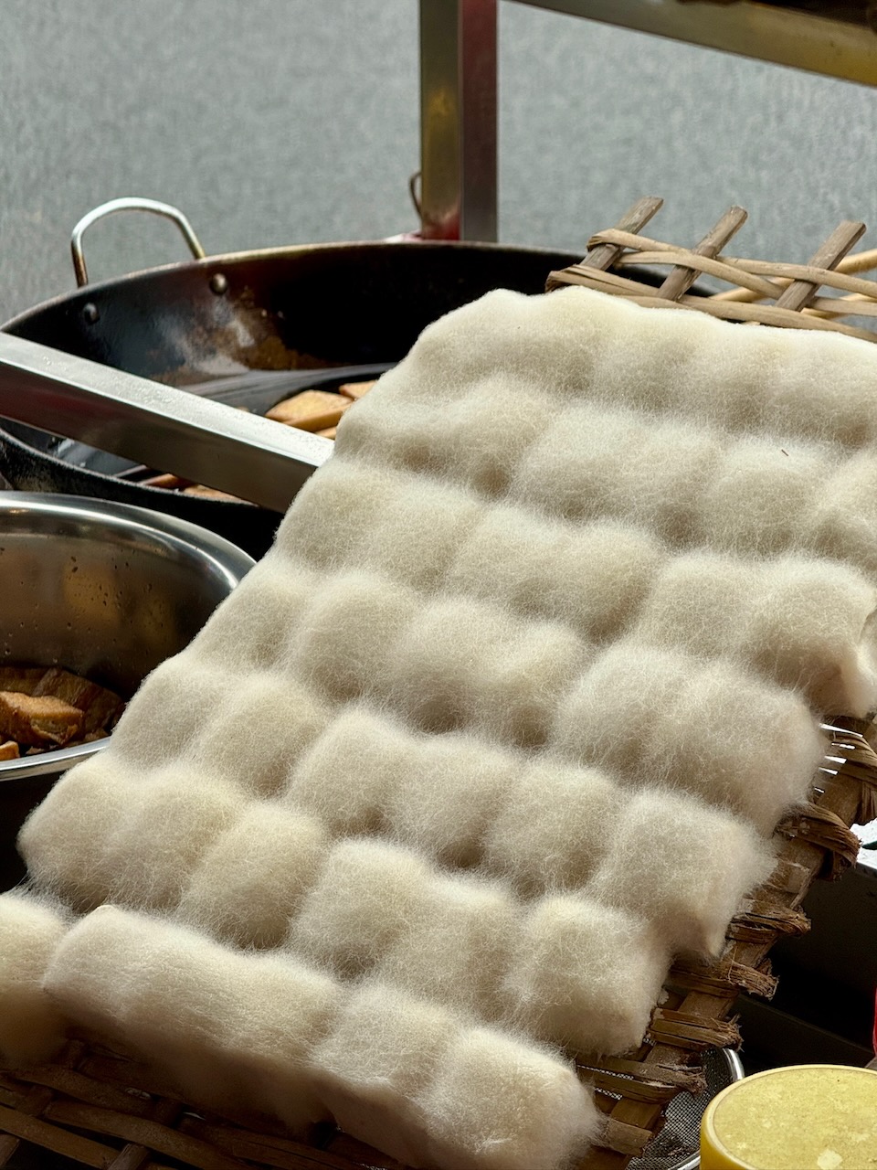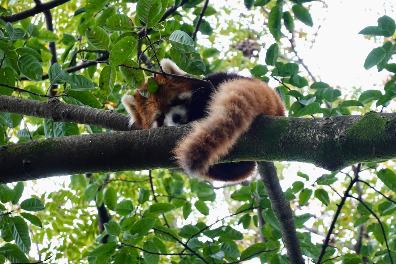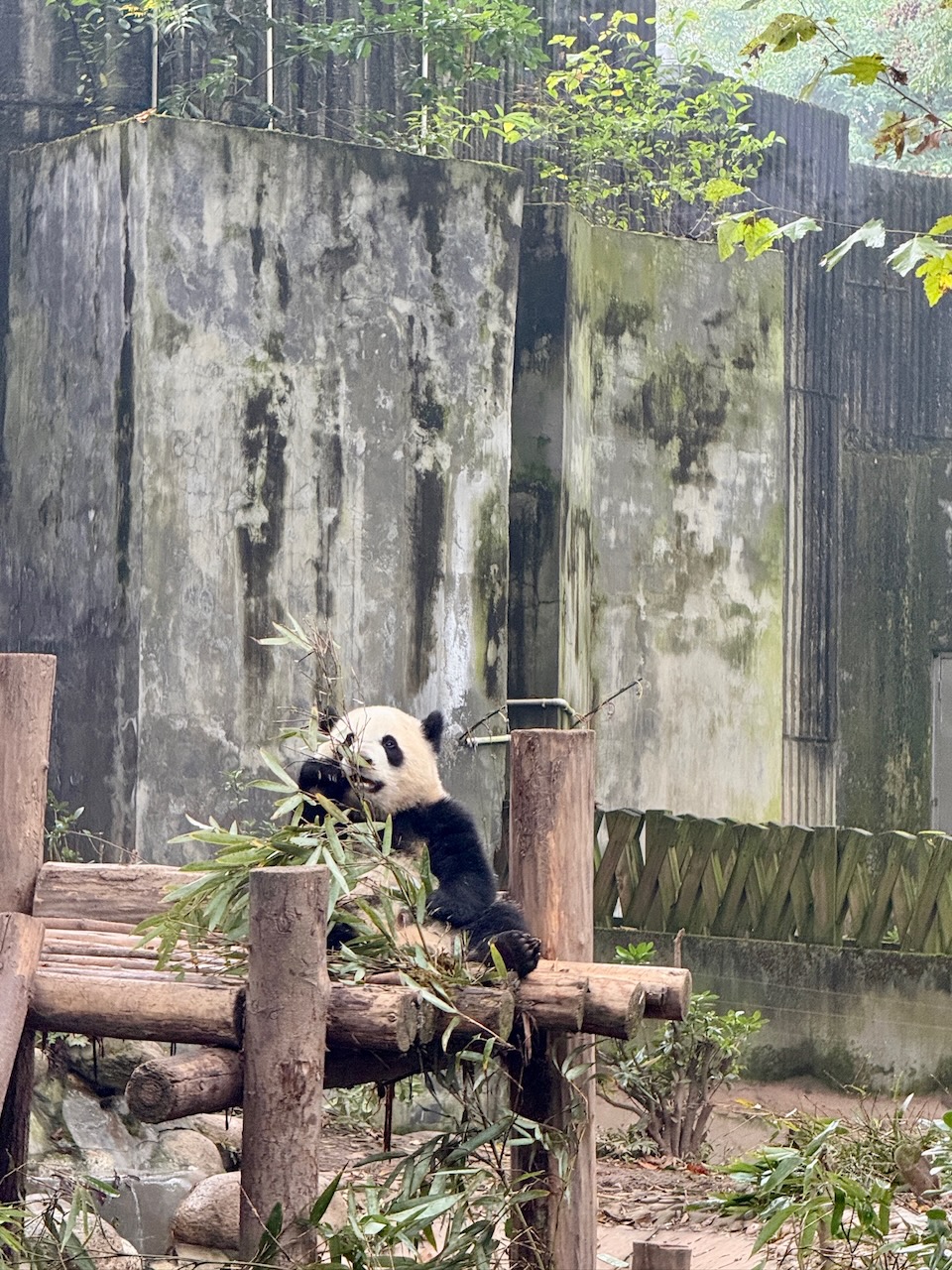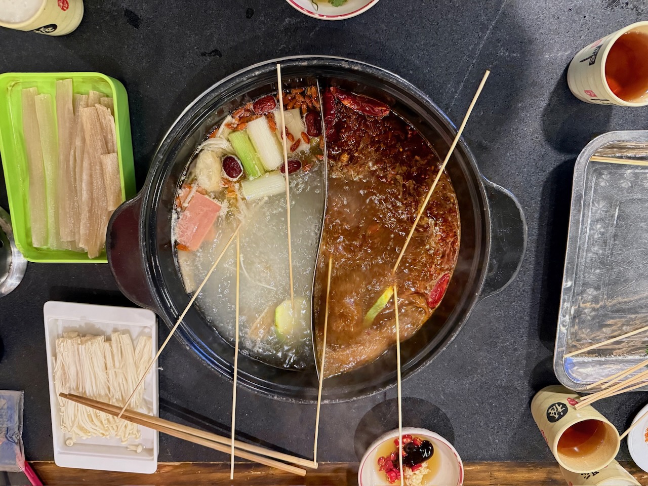 Also ging es am nächsten Tag los zur Panda Research Base. Schon lange zuvor hatten wir uns schlau gemacht, welche Aufzuchtstationen ethisch in Ordnung gehen und bei welchen die Aufzucht beziehungsweise die Forschung eher zweitrangig ist und es mehr darum geht, möglichst viele Touristen an den Pandas vorbeizuschleusen. Die Panda Research Base ist die offizielle staatliche Aufzuchtstation für Pandas. Obwohl wir schon viel darüber gelesen hatten, schockten uns bei der Ankunft die schieren Massen, die dort anstanden, dann trotzdem. Die Schlangen am Europa-Park an einem Schweizer Feiertag kommen knapp dorthin. Die Tickets, die wir über Trip.com gebucht hatten, mussten wir wie bisher üblich gar nicht vorweisen, da sie sowieso mit dem Pass verknüpft waren, den wir am Eingang scannen mussten. Die gesamte Meute rannte so schnell wie möglich in die gleiche Richtung, wir huschten hinterher und schon bald waren wir bei den ersten Pandagehegen. Sobald jemand einen Panda erblickte, kreischten, schrien und hüpften die Leute aufgeregt auf und ab; da halfen auch alle «Keep Quiet»-Schilder nichts und verständlicherweise verzogen sich die Pandas meistens wieder. Wir stellten uns wie alle anderen in eine Schlange, wobei man darin an einem Gehege vorbeigeschleust wurde, in dem ein einzelner Panda war. Jeweils etwa 20 Personen durften gleichzeitig zum Gehege und bekamen drei Minuten Zeit, um Fotos zu machen. Uns war das Ganze zu viel und das erste Gefühl, das aufkam, war Enttäuschung. Wir hatten uns von der Research Base mehr als eine Art grossen Zoo nur für Pandas erhofft. Je weiter wir ans andere Ende des Geländes kamen, desto weniger Touristen waren an den Gehegen. Wir glauben, die meisten Touristengruppen haben nur wenig Zeit, gehen zu den ersten zwei, drei Gehegen und verschwinden dann wieder. Je weiter man sich also von den Eingängen entfernt, desto mehr Ruhe gibt es. Nachdem wir jede Ecke des Parks erkundet hatten, verliessen wir die «Panda Research Base» am nordwestlichen Eingang und gingen zum öffentlichen Bus, der uns zurück in die Innenstadt brachte. An diesem Abend wollten wir unbedingt den bekannten, aus Chengdu stammenden chinesischen Hotpot ausprobieren. Es gibt ihn jeweils als halb scharfe und halb milde Brühe, grösstenteils scharfe oder grösstenteils milde Brühe. Da wir eigentlich nie Mühe mit scharfem Essen hatten, bestellten wir natürlich den Topf mit mehr scharfer Brühe und Schärfegrad drei von vier. Wir bekamen ein Lätzchen umgebunden und es wurden verschiedene Gemüse, Tofu, Nudeln und Fleisch serviert, um sie in der Brühe zu kochen. Die scharfe Brühe war leuchtend rot und wir begannen, unsere Beilagen möglichst darin zu tunken. Wir merkten schnell, dass dies nun wirklich scharf war. Es war sogar derart scharf, dass wir immer mehr Schwierigkeiten mit unserem Kreislauf bekamen; uns wurde schwindelig und Eva hatte bald einen so extrem roten Kopf, dass sogar Chinesen auf der Strasse stehen blieben, um von ihr Fotos zu schiessen. Endlich war etwas mal richtig scharf, aber es war ganz klar eine körperliche Grenzerfahrung. Wir sind zwar froh, sie gemacht zu haben, aber in gleichem Ausmass müssen wir es nicht nochmals erleben.