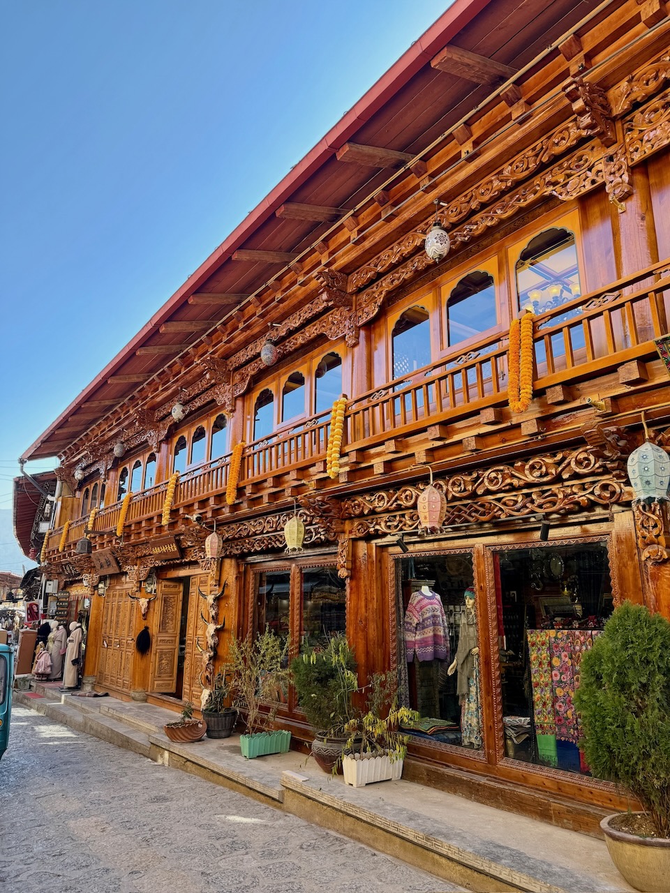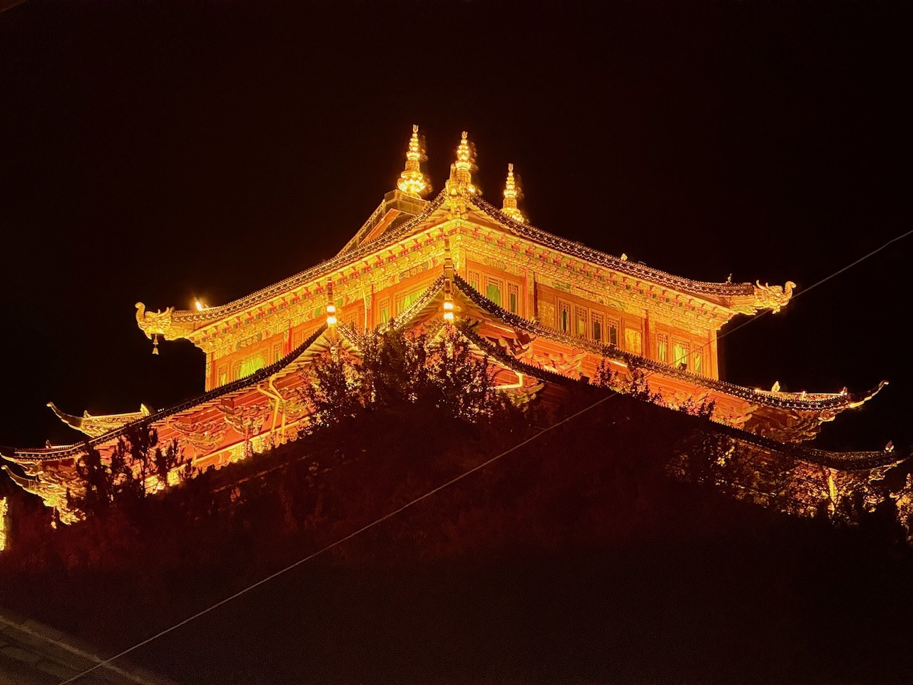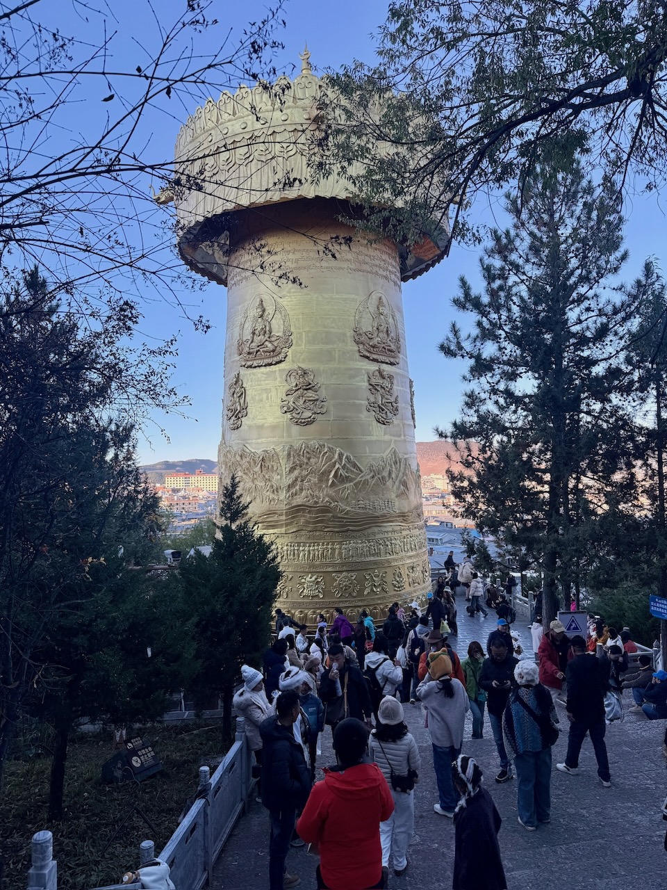 Wir schlenderten durch die Altstadt von Shangri-La, die leider 2015 aufgrund eines Kabelbrands fast komplett abbrannte, aber sie wurde in grossen Teilen wieder aufgebaut, wobei Wert darauf gelegt wurde, dass die Häuser nach traditionellem Handwerk wieder errichtet werden. Die Altstadt war erstaunlich leer, Touristen hatte es nicht viele. Wir trafen im einzigen Café mit einer italienischen Kaffeemaschine einen Italiener, ansonsten hatte es einige Binnentouristen – erkennbar daran, dass sie Sauerstoffflaschen mit sich trugen –, aber grösstenteils war es ruhig und kalt. Die meisten Häuser hatten eine zentrale Heizquelle, einen Holzofen, und darum herum versammelten sich die Betreiber der Läden oder Restaurants. Auch im Restaurant, wo wir eine Art Yak-Pie zum Mittagessen hatten und dazu Yak-Buttertee tranken – es klingt zwar ein wenig gewöhnungsbedürftig, ist aber eigentlich ganz gut –, war es bitterkalt. Wir froren sogar in den fünf Lagen Kleidern, die wir schichteten. Wir merkten, dass uns langsam die Puste ausging und wir bei der Temperatur irgendwann zurück ins Hotel mussten, aber den zentralen Guishan-Tempel wollten wir noch erklimmen. Er steht mitten in der Stadt und ist von überall gut sichtbar auf einem kleinen Hügel gebaut, dem Schildkrötenhügel. Es sind nicht viele Stufen, die man bis zum Tempel erklimmen muss, aber wir mussten immer wieder innehalten und tief durchatmen, bevor wir weitergehen konnten. Oben angekommen, bietet sich ein wunderschöner Blick auf die Altstadt, und auf einem Vorsprung befindet sich die mit 21 Metern Höhe und 60 Tonnen Gewicht grösste Gebetsmühle der Welt. Wir liessen es uns nicht nehmen, auch mitzuhelfen, die Gebetsmühle einige Runden am Drehen zu halten. Den Abend verbrachten wir in einem Restaurant, in dem es Yak-Hotpot gab – übrigens eine Touristenattraktion, die es in der ganzen Stadt gibt.