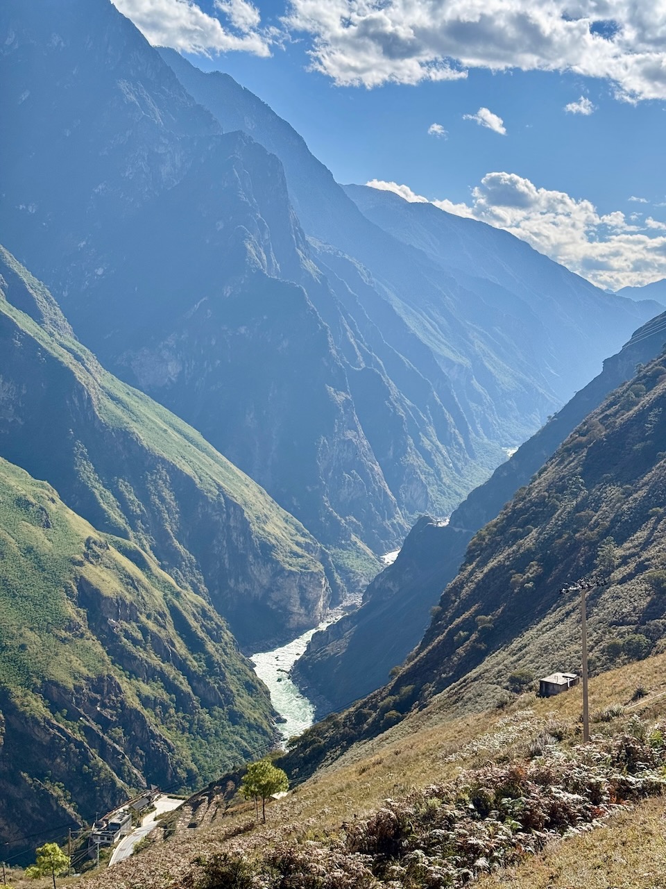 Die Aussicht auf den Jangtse lässt einen die Strapazen jedoch komplett vergessen. Der Fluss gilt als Lebensader Chinas; mit seinem Wasser wird rund zwei Drittel des chinesischen Reises produziert. Die Legende der Tigersprungschlucht besagt, dass ein Tiger vor einem Jäger floh und am Ufer in die Enge getrieben wurde. Er sprang mit einem Satz auf einen Stein in der Mitte des Flusses und von dort ans andere Ufer. Die Schlucht ist eine der tiefsten der Welt, an einigen Stellen bis zu 3700 Meter tief. Unser Wanderweg verlief auf etwa 2000 bis 2400 Metern entlang der Steilwand. Schliesslich erreichten wir Tinas Guesthouse, wo wir uns ein wohlverdientes Shangri-La-Bier gönnten. Gerne wären wir noch direkt zum Fluss hinuntergestiegen, aber der Ab- und Aufstieg hätte jeweils nochmals zwei Stunden gedauert. So kauften wir Fahrkarten für den Bus zurück nach Lijiang.