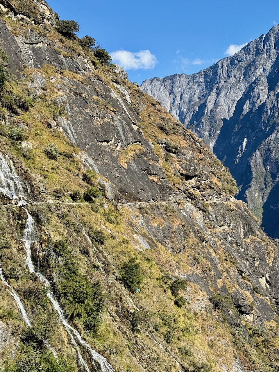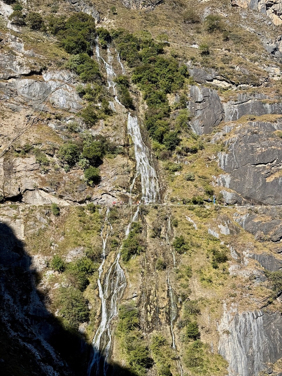 Die Fahrt ging los, und einige Zeit später hielten wir am Eingang des «Scenic Spots», wo man uns den Eintritt verkaufte. Zeitgleich erklärte jemand auf Chinesisch und mit gebrochenem Englisch via Übersetzungs-App die Optionen im Park. Wir wurden schliesslich in einen anderen Transporter verladen, der uns genau dort auslud, wo wir es geplant hatten. Der Aufstieg führte zunächst eine steile Bergstrasse hinauf. Nach etwas mehr als einer Stunde hatten wir die Höhe erreicht und der eigentliche Wanderweg begann. Im Halfway Guesthouse – das so heisst, weil es auf der halben Strecke der grossen Wanderung liegt – gönnten wir uns einen Kaffee und ein Croissant. Ab dort staute sich der Weg ein wenig, da viele geführte Tagestouren zur gleichen Zeit starteten. Der Pfad ist teilweise nur ein Trampelpfad in einem Steilhang, und man muss zwei Wasserfälle überqueren, was recht glitschig war. Oft versperrten Ziegen, Hühner oder Touristen bei Social-Media-Fotoshootings den Weg.