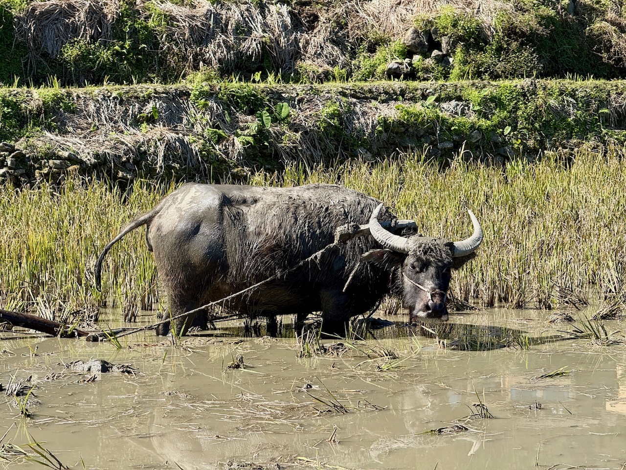 Eigentlich viel zu spät am Tag, es war schon gegen Mittag, waren wir bereit, die Gegend zu erkunden. Wir warfen uns in Wanderkluft, kletterten weiter nach unten und balancierten auf den etwa 10 cm breiten Lehmwänden, welche die verschiedenen Terrassen voneinander trennten. Dabei beobachteten wir, wie eine Bäuerin in aller Seelenruhe das Reisfeld mit einem Wasserbüffel pflügte, der selbst bis zum Bauch im Wasser stand. Als wir wieder sicheren Boden unter den Füssen hatten, stiegen wir die Stufen hinauf, assen noch frittierten Schweinebauch in einem grossen Restaurant, in dem viele Arbeiter gerade ihr wohlverdientes Mittagessen einnahmen und machten uns auf den Weg. Die Wanderung führte einen Hügel hinauf, mitten durch den Wald auf eine Gebirgskuppe, der wir für etwa zwei Stunden folgten. Hie und da begegneten wir Leuten, die gerade dabei waren, Felder und Wege vom Gestrüpp zu befreien. Immer wenn wir auf jemanden trafen, winkten uns die Leute schon von Weitem zu und hatten sichtlich Freude daran, uns zuzuschauen, wie wir ratlos vor Weggabelungen standen und auf ihre Hilfe angewiesen waren, die sie uns freundlicherweise gaben. Vom Gebirgskamm hatte man einen tollen Ausblick auf all die Reisterrassen der Region. Alle waren sie überflutet und so ruhig, dass sich der Himmel, die Bäume und die ganze Umgebung darin spiegelten. Am Ende des Weges mussten wir ein steiles Stück hinabsteigen, bis wir wieder auf der Gebirgsstrasse landeten. Wir folgten der Strasse ein Stück bis zum Bada Viewpoint, einem offiziellen «Scenic Spot». Wir entrichteten den Eintritt und liessen uns zusammen mit einer Reisegruppe über die auf Holzplanken gebauten Wege führen. Eine kleine Überraschung hielt der Spot bereit: Es gab einen richtig guten Cappuccino in einem Souvenirladen. Wir hängten irgendwann die geführten Gruppen ab und machten wieder unser eigenes Ding, indem wir die Strasse verliessen und über weitere Reisterrassen nach oben kletterten, immer auf der Hut, nicht abzurutschen und im Schlamm zu landen.