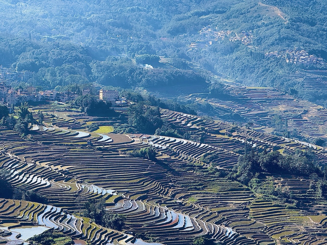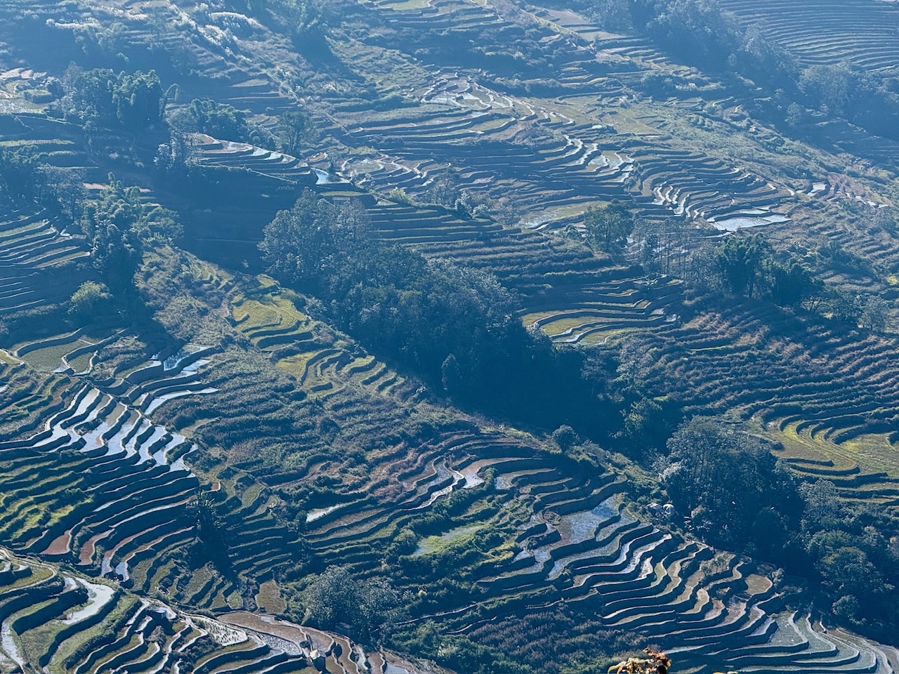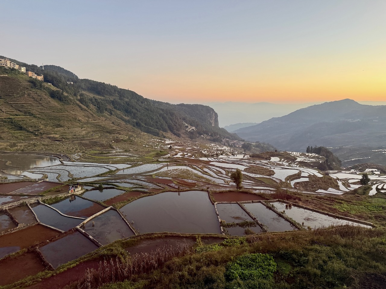 Das Zimmer, das wir bezogen, war grossartig: riesige Panoramafenster mit direktem Blick auf die Reisterrassen und ein schönes Badezimmer mit heissem Wasser, was bei diesen Temperaturen Gold wert war. Das Zimmer selbst war nicht beheizt, aber immerhin verfügte das Bett über einen beheizbaren Topper, der uns nachts Wärme spenden sollte. Wir gingen nochmals nach draussen, um oben an der Hauptstrasse etwas Kleines zu essen. Leider war es auch im Restaurant bitterkalt und auch wenn das Essen heiss serviert wurde, war es nach einigen Minuten wieder abgekühlt. Trotzdem fiel uns sofort der aromatische rote Reis auf, der hier in Yuanyang angebaut wird und eine lokale Spezialität darstellt. Eine unruhige Nacht folgte, da die Heizdecke den Geist aufgab und wir schlotternd im Bett auf den nächsten Morgen warteten. Wir hatten uns extra um 6:00 Uhr einen Wecker gestellt, um bei Sonnenaufgang das Highlight der Region zu betrachten: Die gefluteten Reisterrassen von Yuanyang sind tatsächlich immaterielles UNESCO-Weltkulturerbe und wahrlich ein schöner Anblick, wenn die ersten Sonnenstrahlen auf das Wasser treffen und sich darin spiegeln. Kurz darauf gab es dann auch das rettende Frühstück: Eine Nudelsuppe, die uns stark an das vietnamesische Pho erinnerte, gab uns ein bisschen Wärme zurück. In der Zwischenzeit wurde es durch die aufgehende Sonne auch in unserem Zimmer wärmer und wir zogen uns nochmals zurück, um ein bisschen Schlaf nachzuholen.