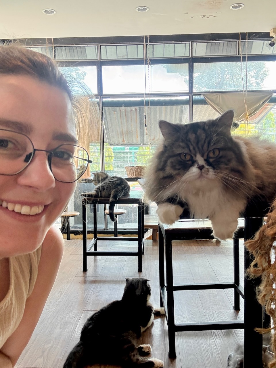 Irgendwie ist die Stadt ganz geschäftig, aber immerhin so übersichtlich, dass man das Gefühl hat, alles Wichtige zu Fuss erreichen zu können. Was extrem auffällt, ist die hohe Dichte an Cafés. Wir waren in den Tagen in Ubon in einigen davon und jedes versucht, sich von den anderen in gewisser Weise abzuheben. Hier gibt es zum Beispiel das Katzencafé und auch wenn wir wissen, dass dies problematisch ist, waren wir dort. Die Besitzer achten jedoch sehr darauf, dass die Katzen nicht gejagt werden. Man sollte sie nur dann streicheln, wenn sie nicht schlafen und nicht auf dem Katzenbaum sitzen. In einem anderen Café, dem «Lovio», scheint der Treffpunkt der gut betuchten Studenten Ubons zu sein. Die iPad- und MacBook-Dichte ist auffallend hoch, die Englischkenntnisse der Baristas sind auffällig gut. Wir bearbeiteten dort viele Fotos und bereiteten uns auf den ersten Grenzübergang unserer zweiten Reise vor.