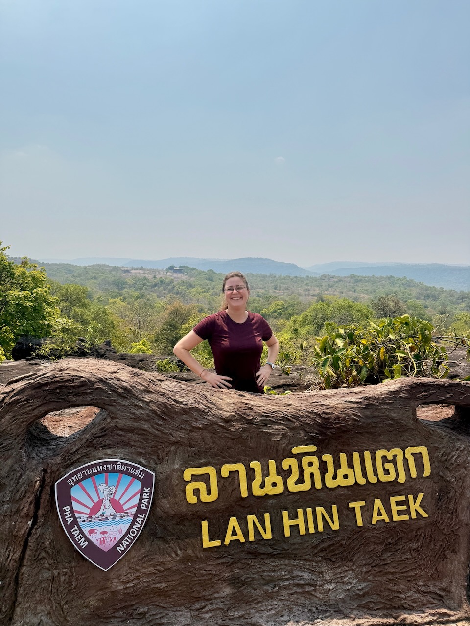 Auch in der Umgebung von Ubon gibt es eigentlich viel zu sehen. Einige der Highlights liegen etwa zwei Fahrstunden entfernt, wo der Mekong die laotisch-thailändische Grenze definiert. Hier gibt es gleich mehrere Nationalparks und im Nachhinein hätte man wohl auch zwei, drei Tage in Chong Mek, der Grenzstadt, verbringen können. Wir haben am zweiten Tag in Ubon über die Rezeption des Hotels einen Fahrer organisiert, der uns zum Pha Taem Nationalpark brachte. Hier, direkt in der Felswand, die weit hinunter bis zum Flussbett abfällt, befinden sich rund 4000 Jahre alte Wandmalereien. Hierher kommen wohl nicht gerade viele westliche Touristen. Nachdem wir das Besucherzentrum besichtigt hatten, kam sogleich der Chef-Ranger auf uns zu und machte mit uns ein Selfie – und wir natürlich auch mit ihm. Die Aussicht von der Felswand hinunter auf die Flussebene des Mekongs ist einzigartig. Nachdem wir uns sattgesehen hatten, machten wir uns in der brütenden Hitze auf, die Wandmalereien anzusehen. Dabei steigt man am Felsen immer weiter nach unten. Der Weg ist zwar sehr gut gesichert und grösstenteils mit Geländern versehen, in der Regenzeit kann es aber doch gefährlich sein. Wir waren froh über unsere Schuhe mit gutem Profil und staunten nur darüber, wie andere diesen Weg in Flip-Flops bewältigten. Die Wandmalereien sind nicht immer auf den ersten Blick ersichtlich, aber die Informationstafeln erklären die verschiedenen Abbildungen gut. Hat man sie erst einmal erblickt, erkennt man Menschen, Handabdrücke, Elefanten und Schildkröten. Es ist faszinierend, wenn man bedenkt, dass die Abdrücke dieser Hände bereits 4000 Jahre alt sind. Nach der Wanderung brachte unser Fahrer uns noch zu einem Tempel, der direkt über dem Mekong gebaut wurde. Wenn hier die Trommeln ertönen, hört man es das ganze Tal entlang bis weit über den Fluss hinweg.